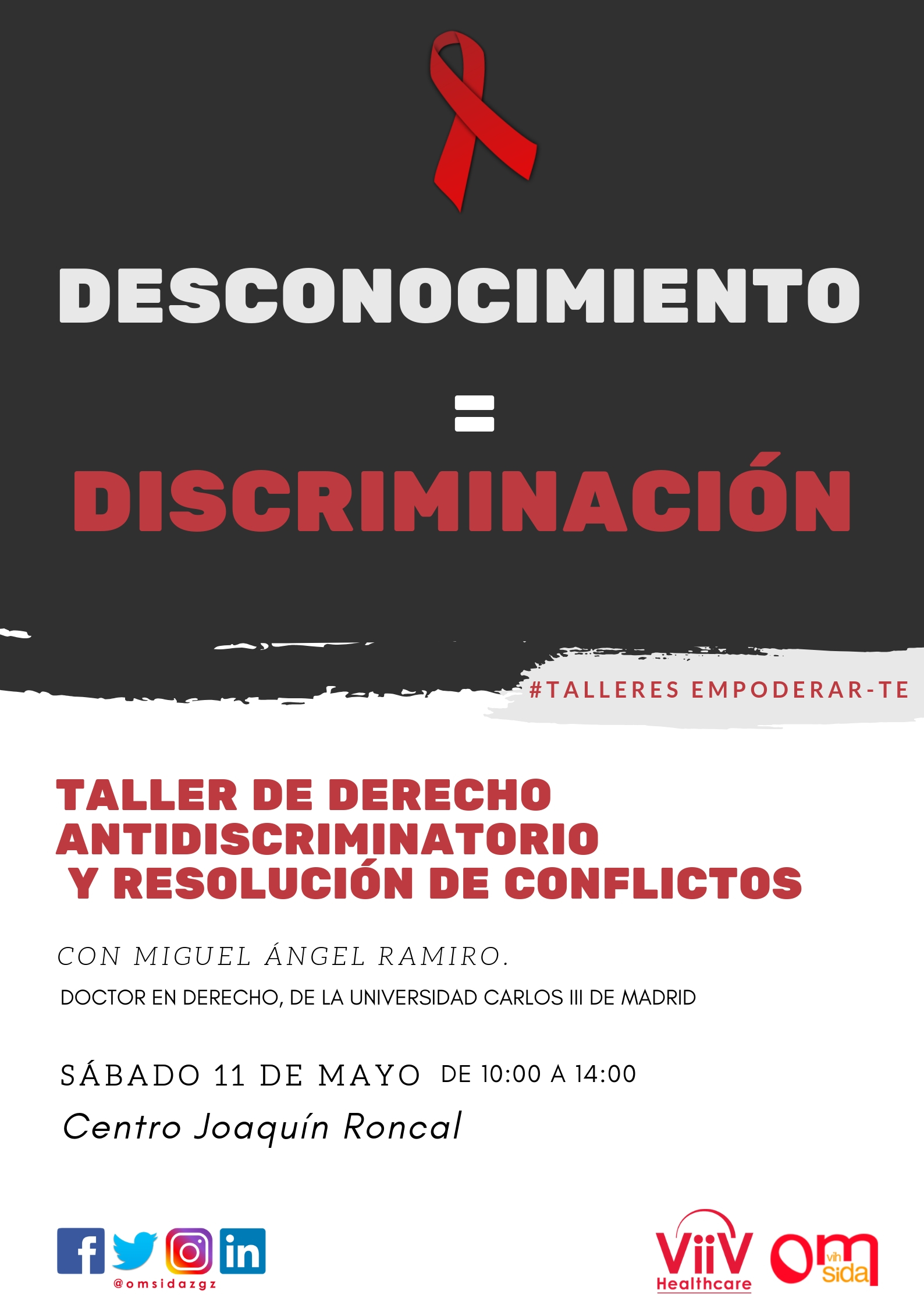OMSIDA, Asociación para la ayuda a personas afectadas por el virus VIH, impartirá un nuevo taller el sábado 11 de mayo en el Centro Joaquín Roncal de Zaragoza: «Taller de derecho antidiscriminatorio y resolución de confilictos»